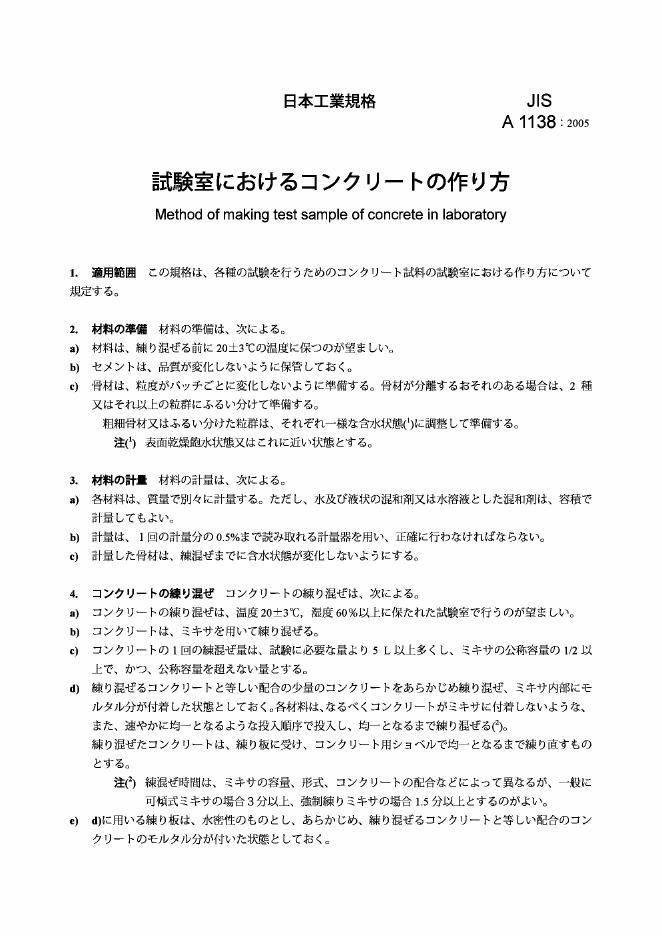 JIS A1138-2005 实验室内混凝土试样的制作方法