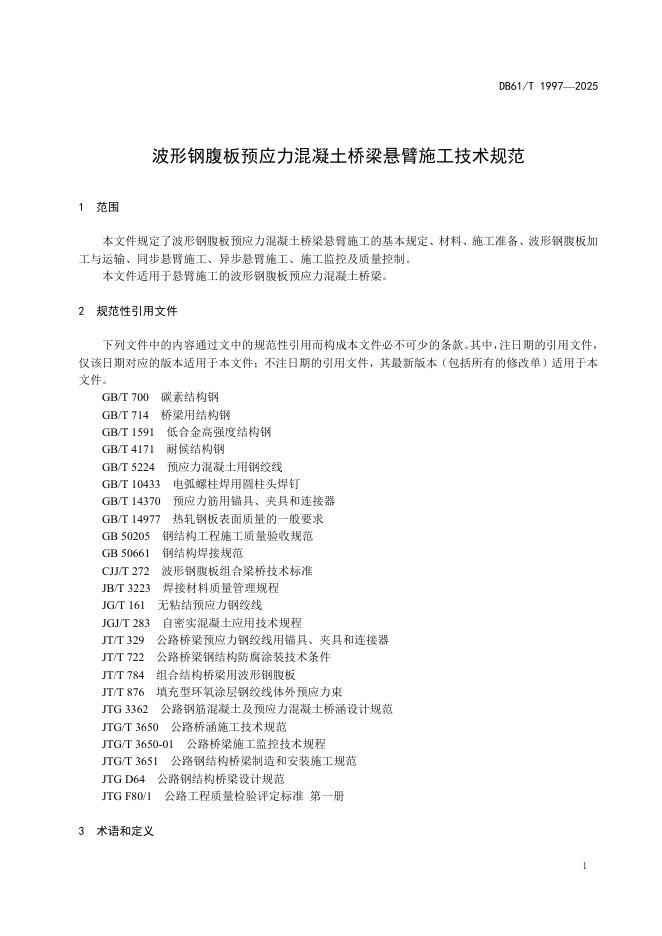 DB61/T 1997-2025 波形钢腹板预应力混凝土桥梁悬臂施工技术规范