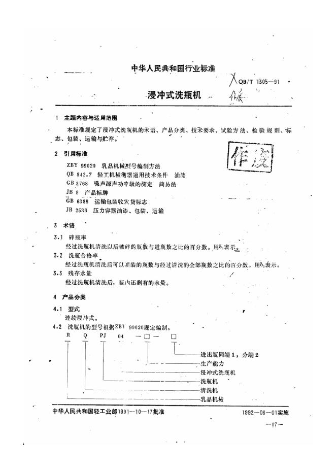 QB/T 1305-1991 浸冲式洗瓶机