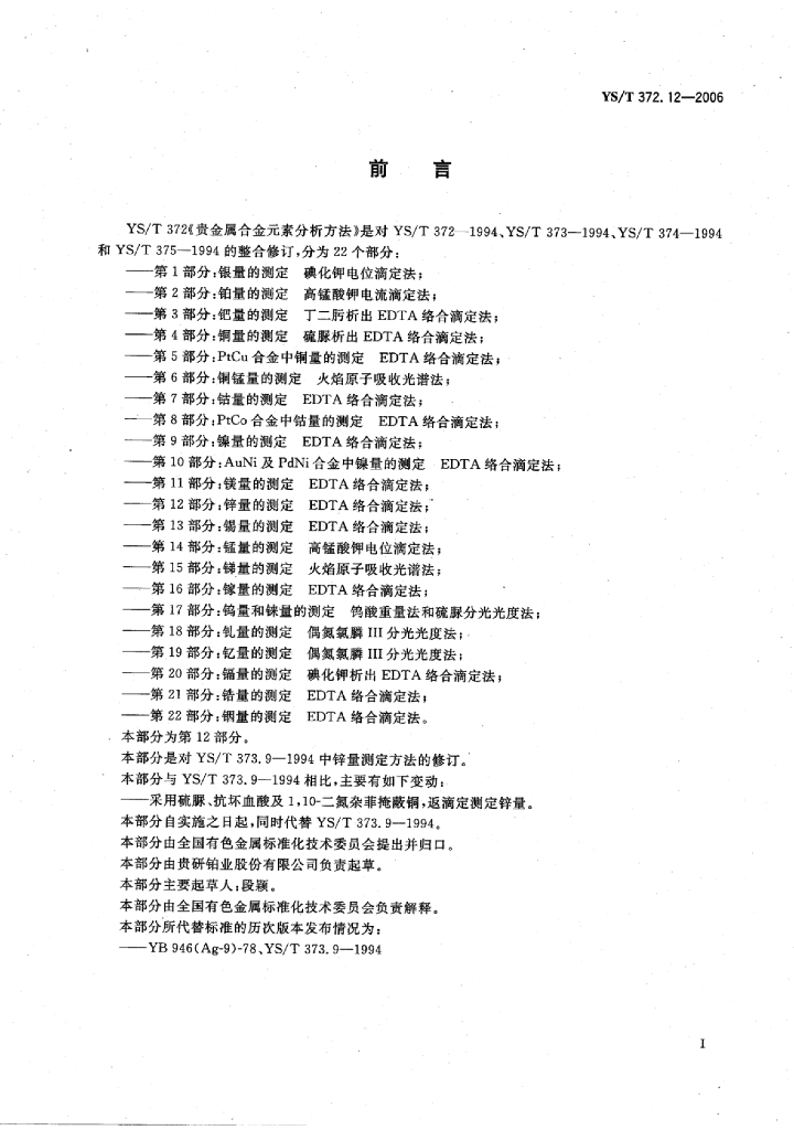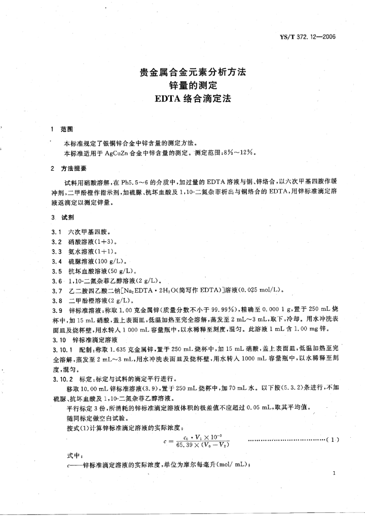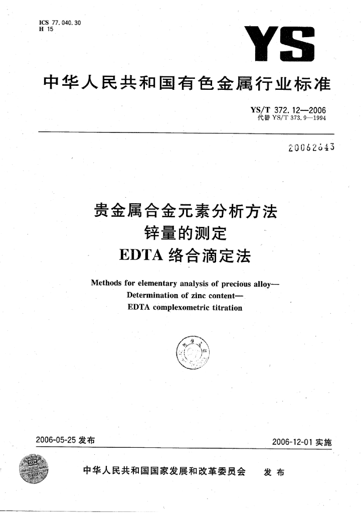 YS/T 372.12-2006 贵金属合金元素分析方法 锌量的测定EDTA络合滴定法