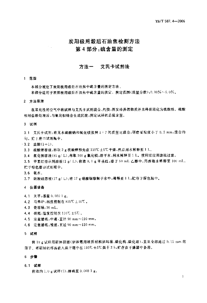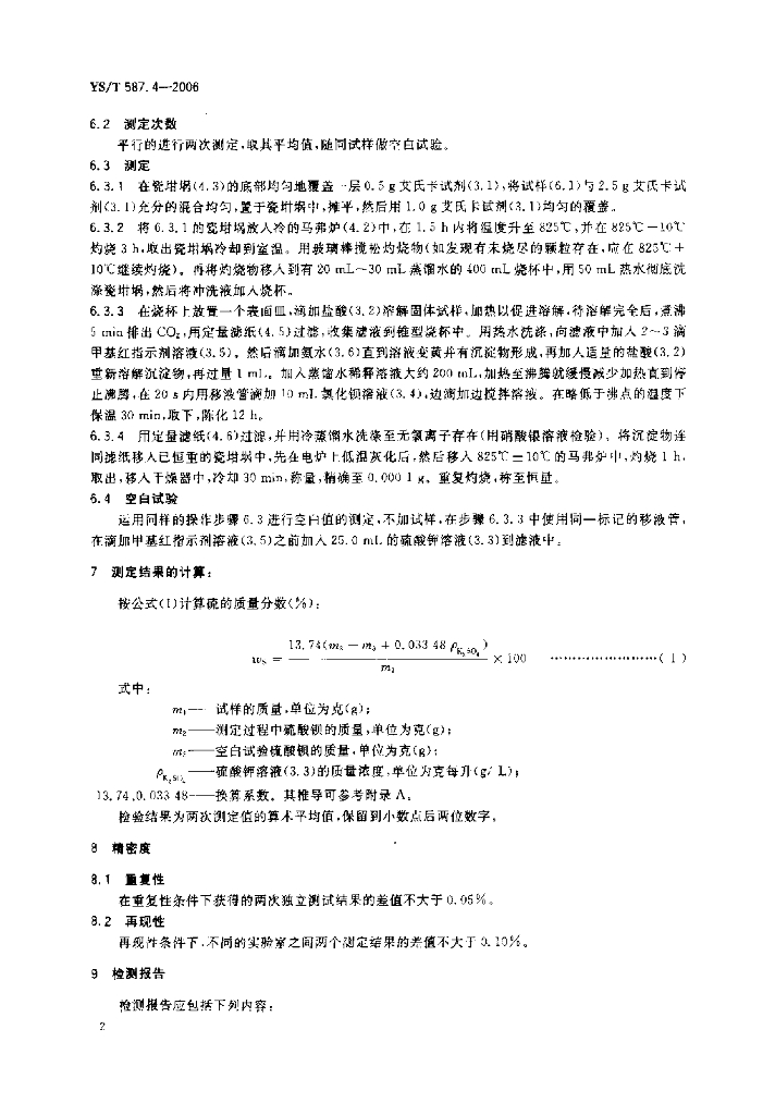 YS/T 587.4-2006 炭阳极用煅后石油焦检测方法 第4部分:硫含量的测定