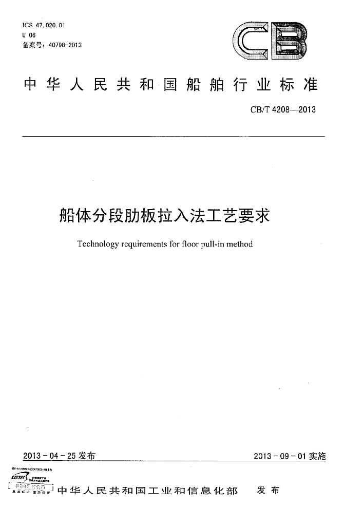 CB/T 4208-2013 船体分段肋板拉入法工艺要求