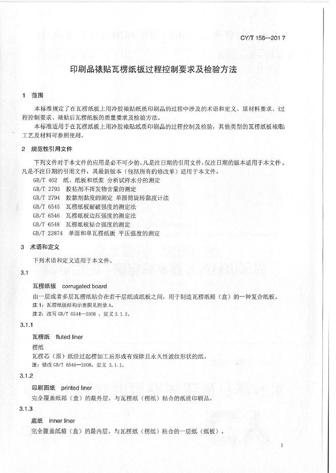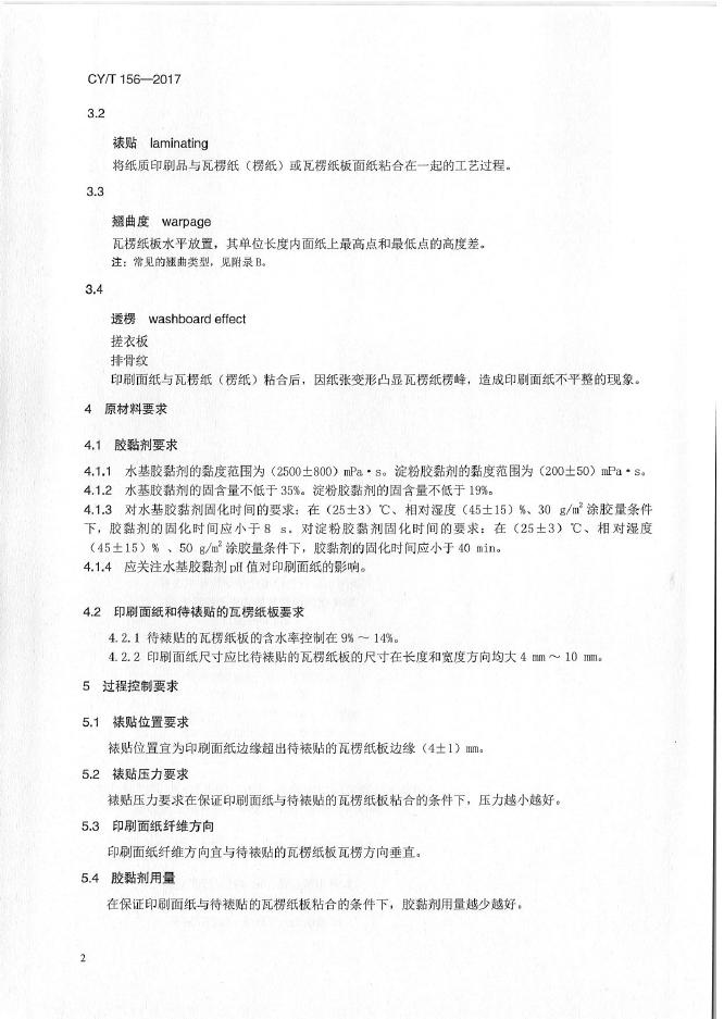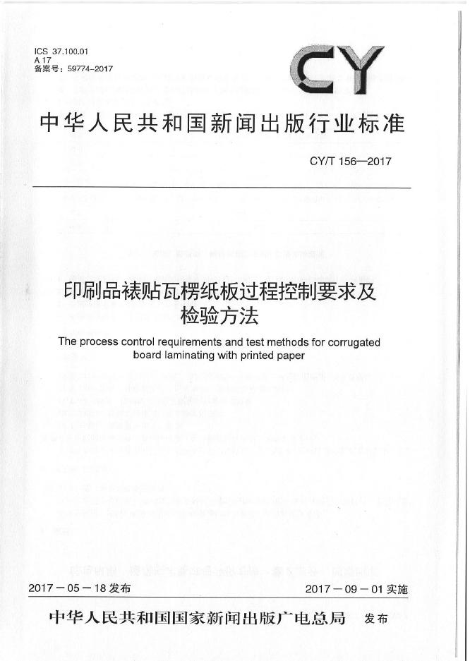 CY/T 156-2017 印刷品裱贴瓦楞纸板过程控制要求及检验方法