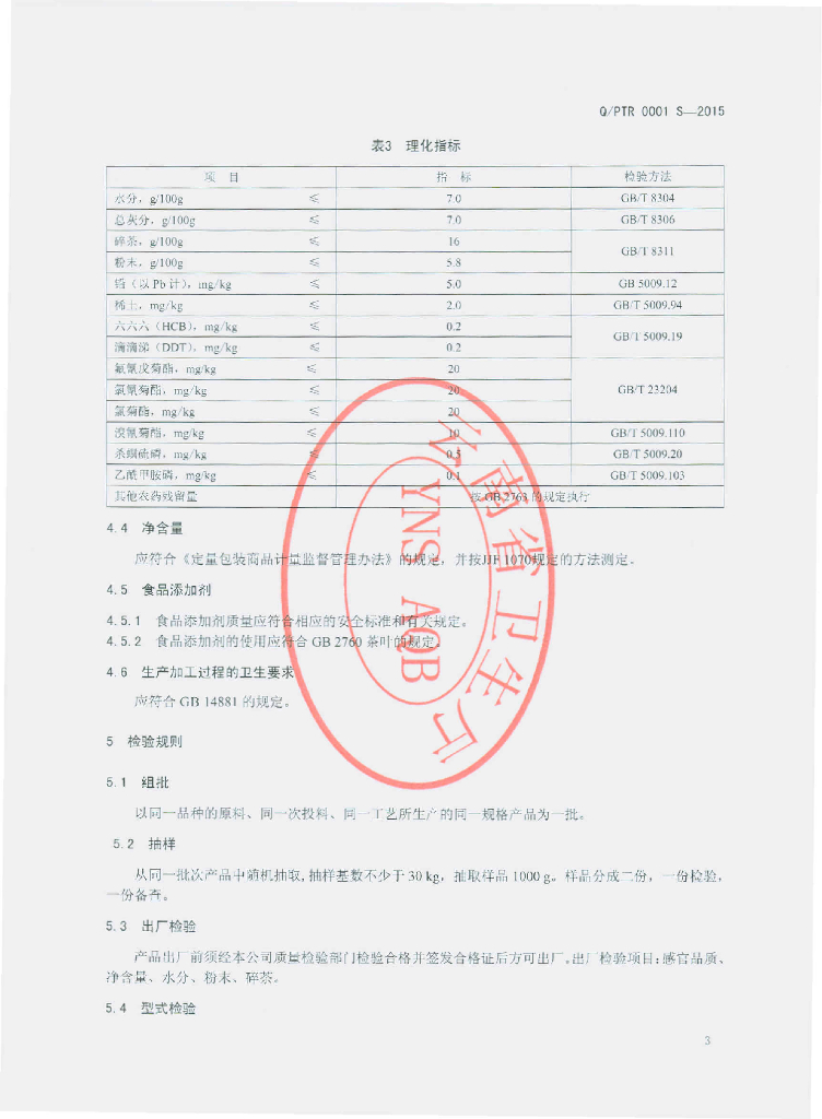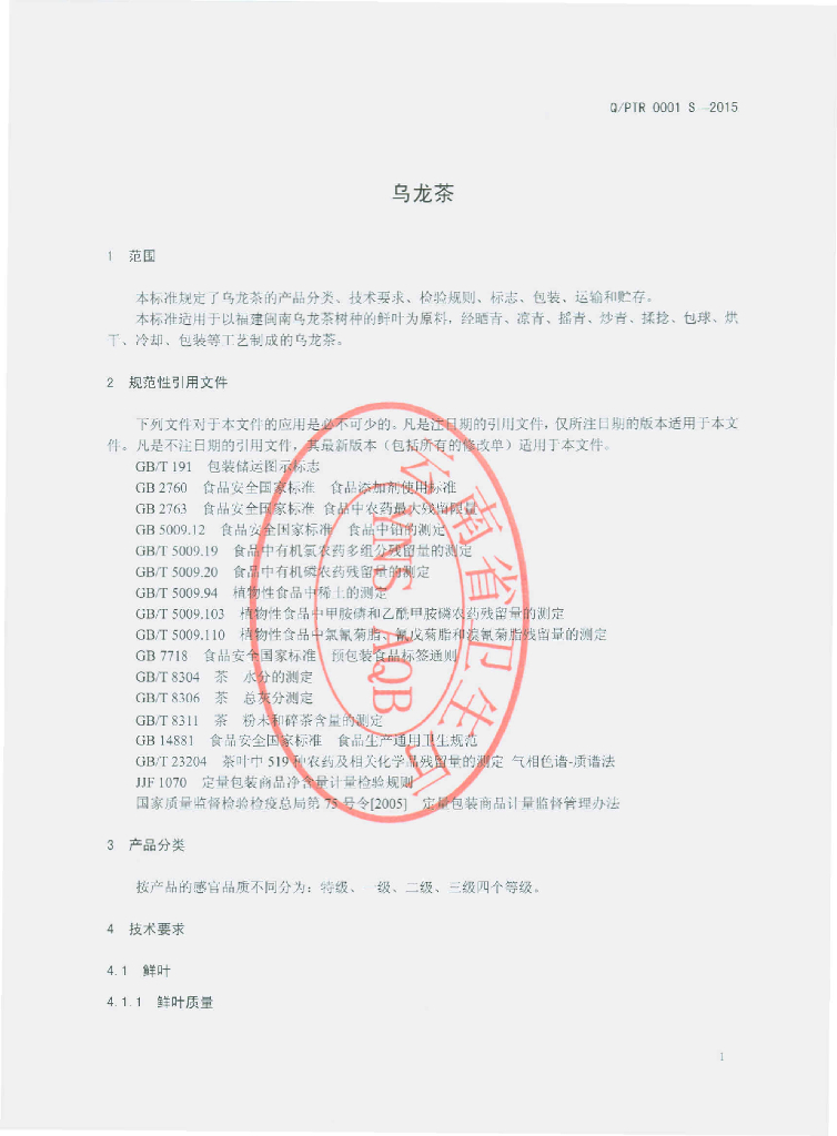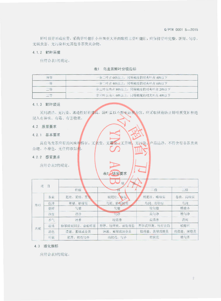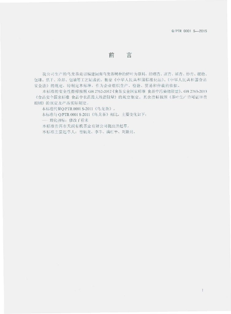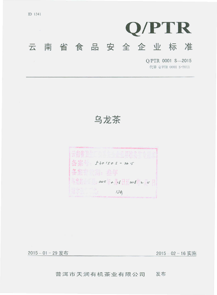 Q/PTR 0001S-2015 普洱市天润有机茶业有限公司 乌龙茶