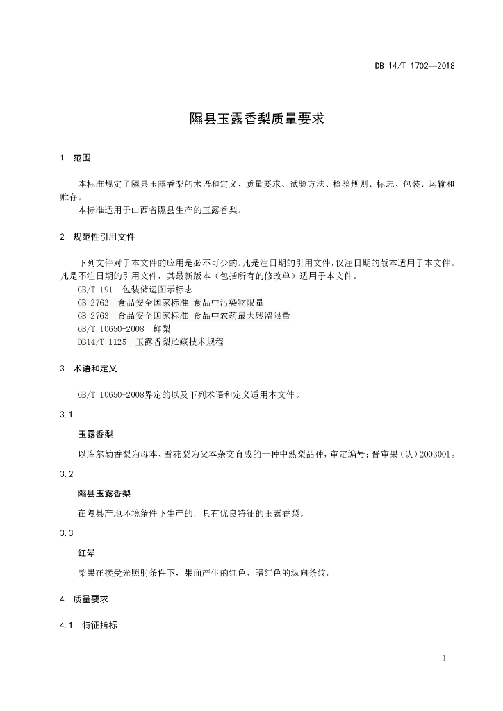 DB14/T 1702-2018 隰县玉露香梨质量要求