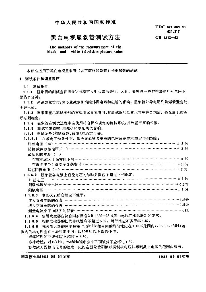 GB/T 3212-1982 黑白电视显象管测试方法