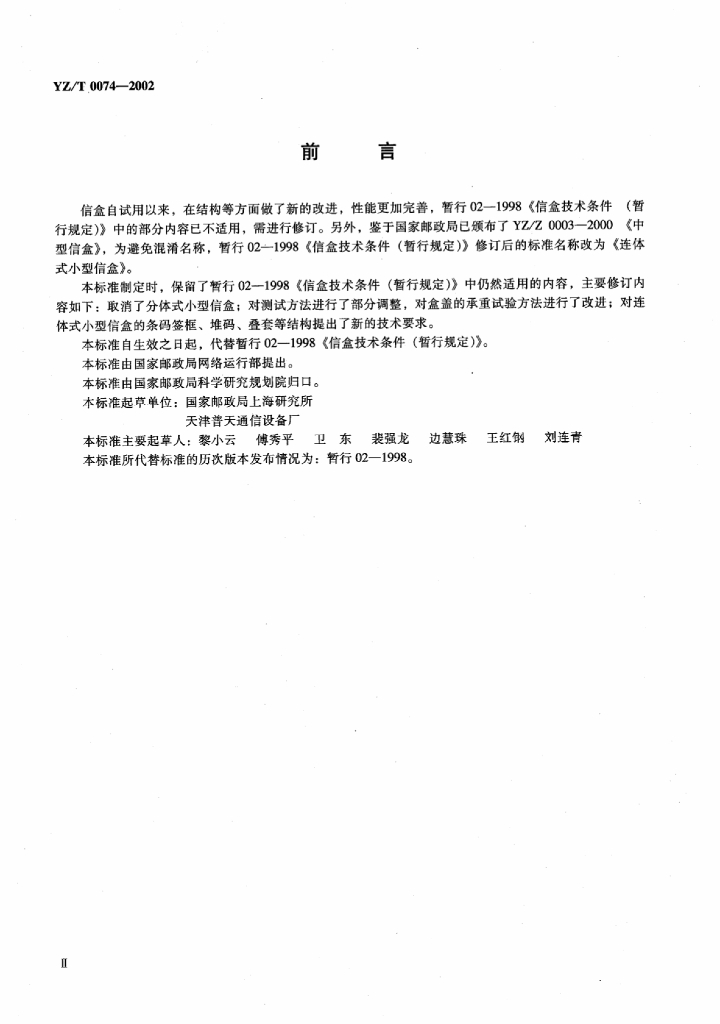 YZ/T 0074-2002 连体式小型信盒