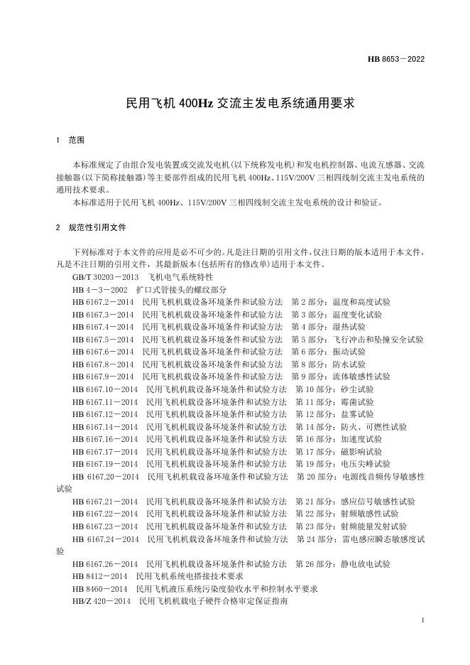 HB 8653-2022 民用飞机 400Hz 交流主发电系统通用要求