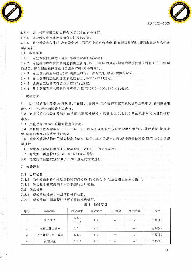 AQ/T 1022-2006 煤矿用袋式除尘器