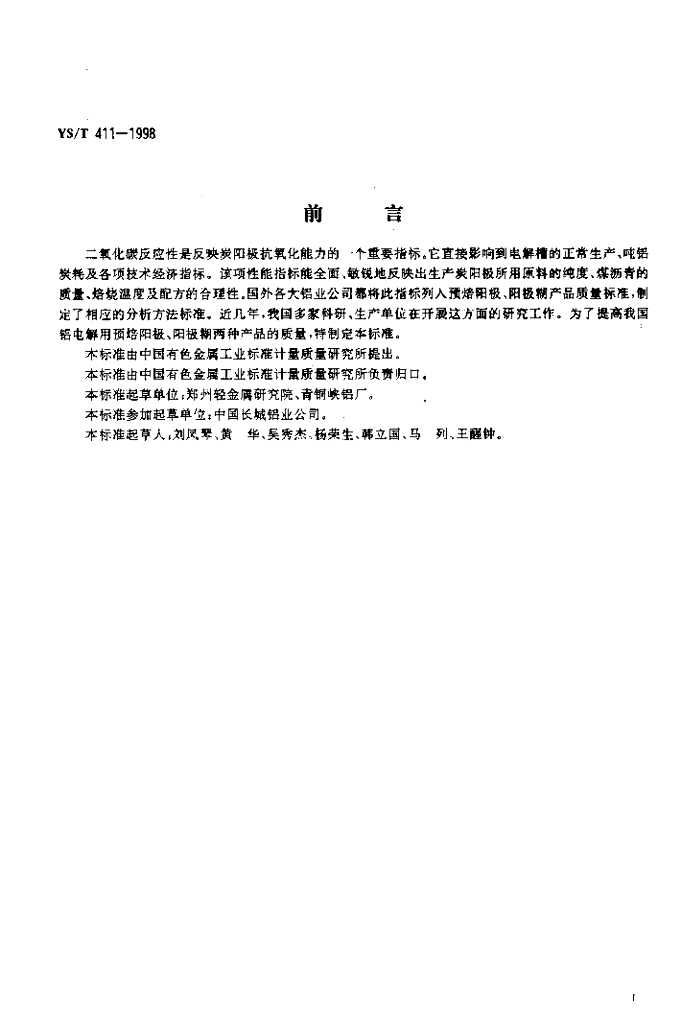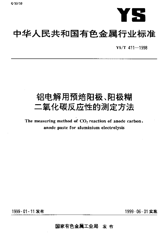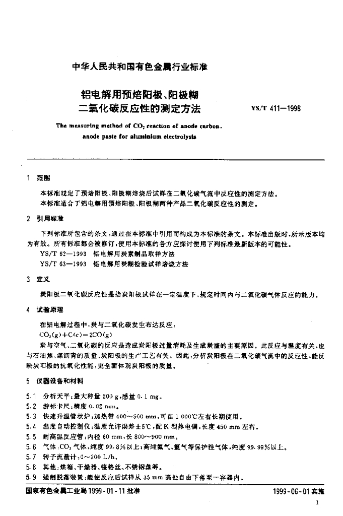 YS/T 411-1998 铝电解用预焙阳极、阳极糊二氧化碳反应性的测定方法