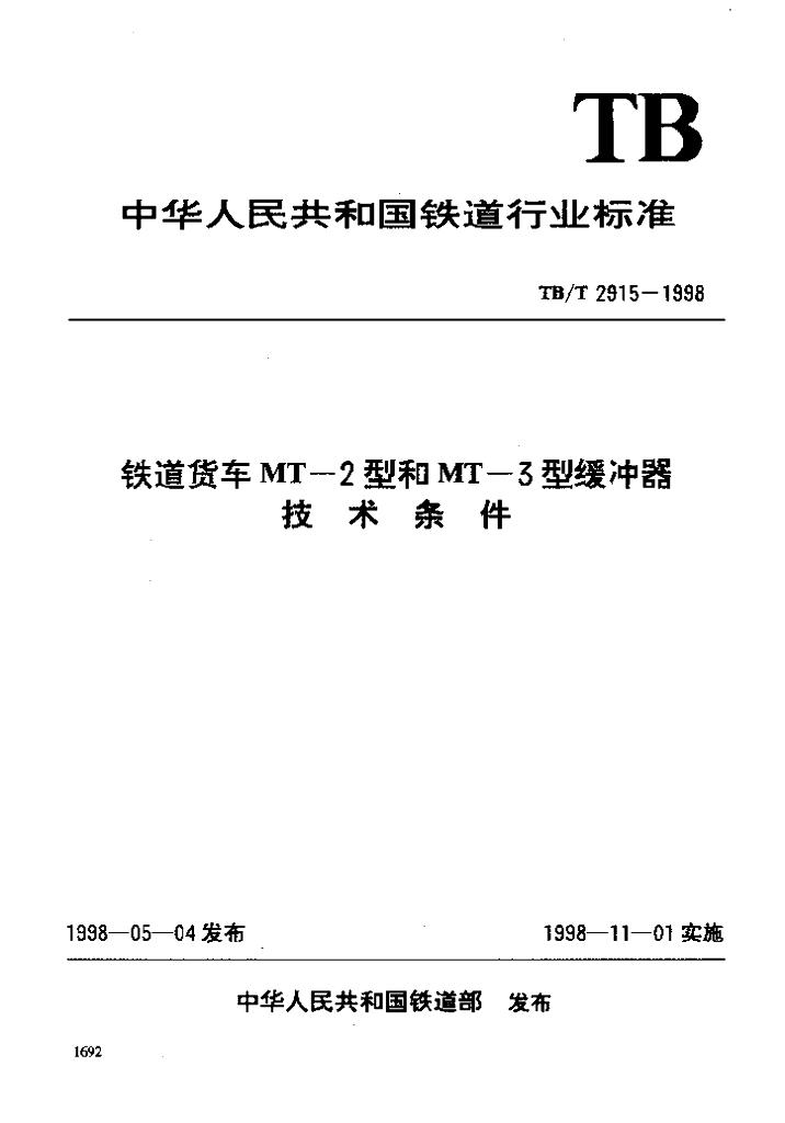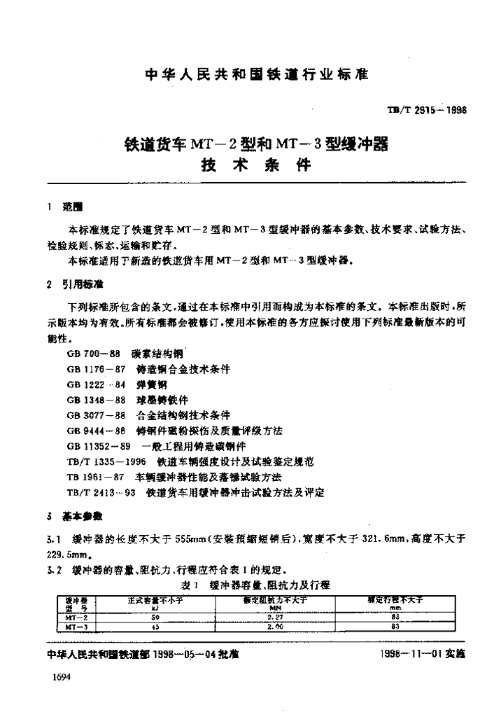 TB/T 2915-1998 铁道货车MT-2型和MT-3型缓冲器技术条件