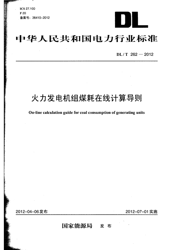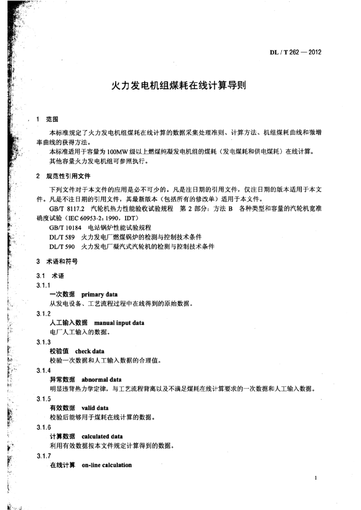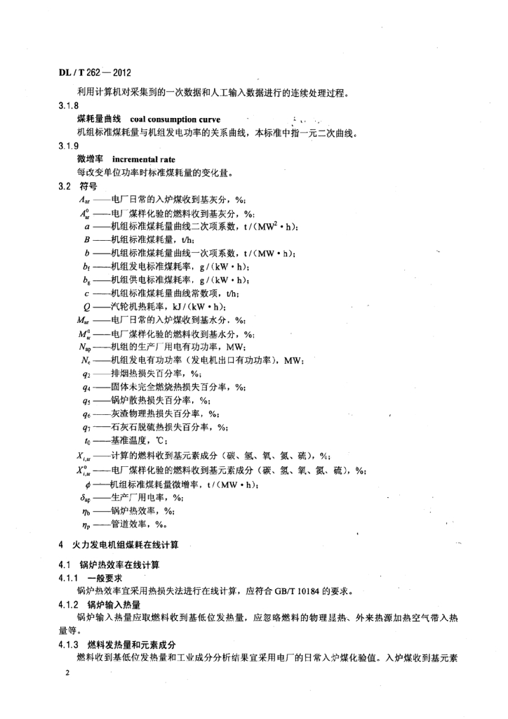 DL/T 262-2012 火力发电机组煤耗在线计算导则