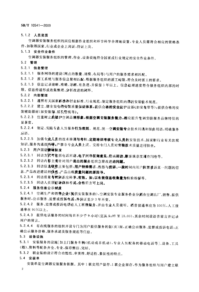 SB/T 10541-2009 房间空气调节器安装服务规范