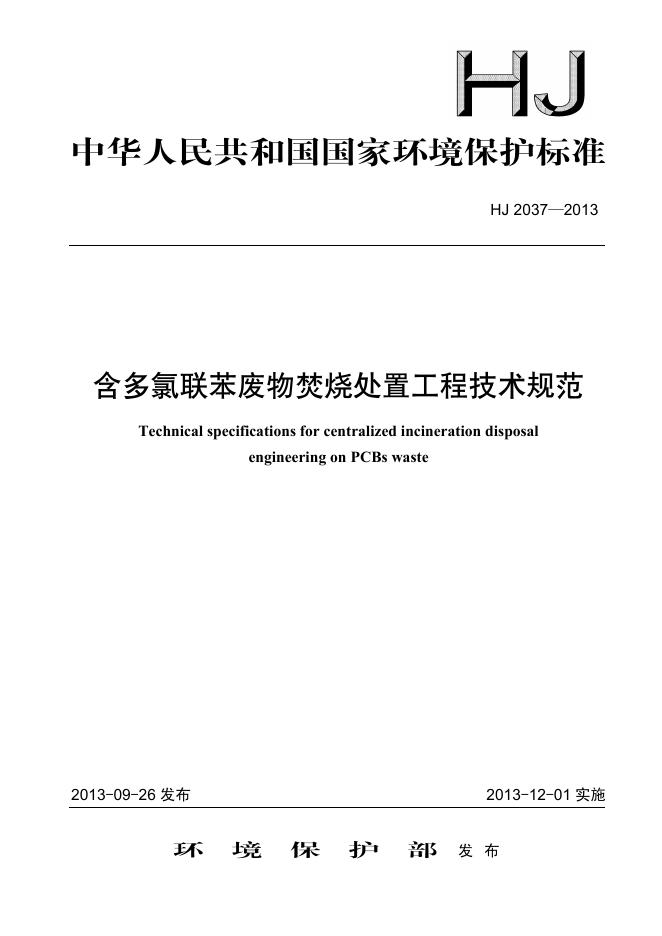 HJ 2037-2013 含多氯联苯废物焚烧处置工程技术规范