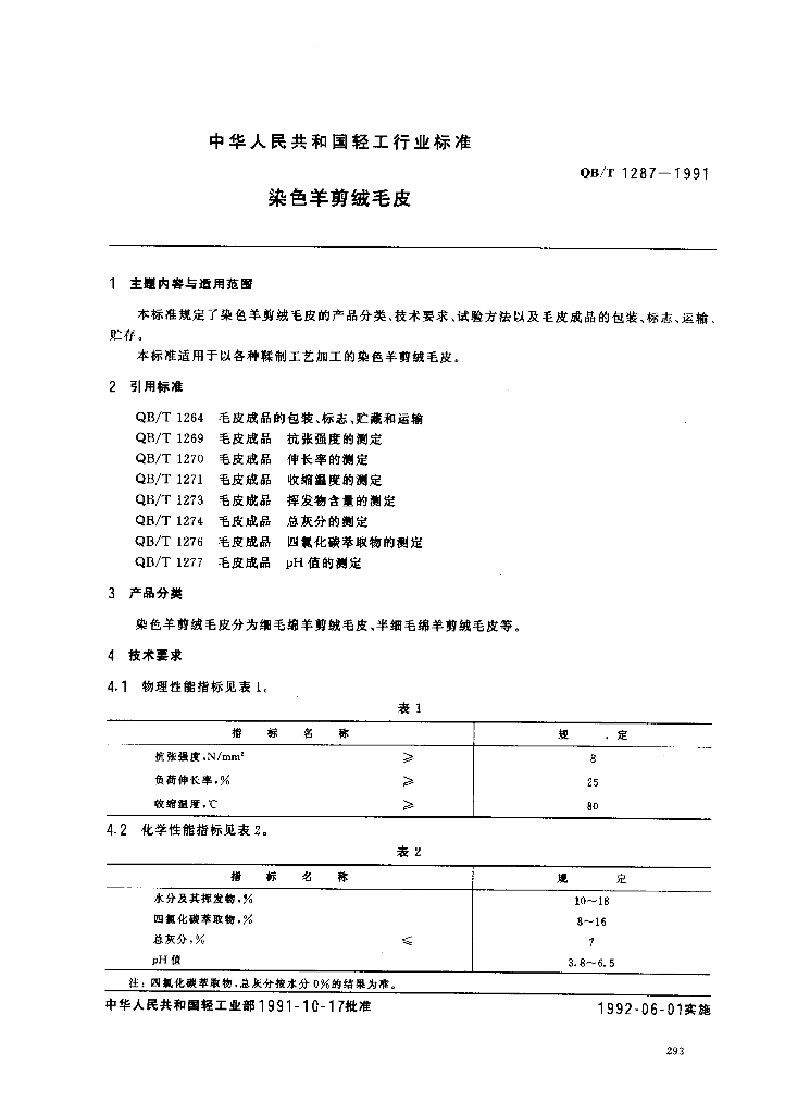 QB/T 1287-1991 染色羊剪绒毛皮