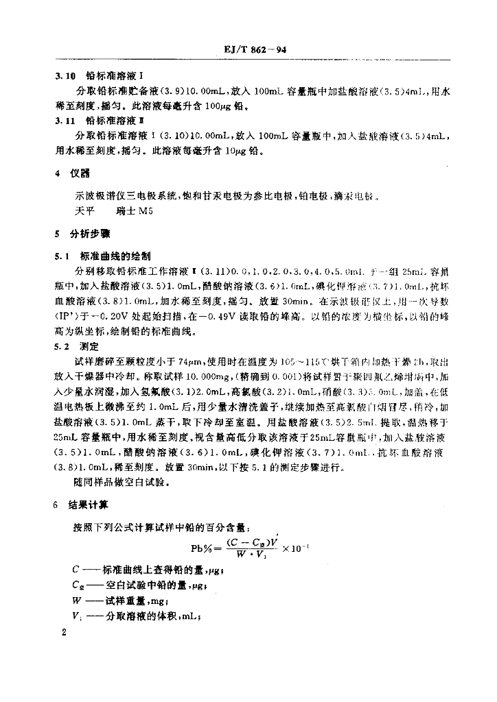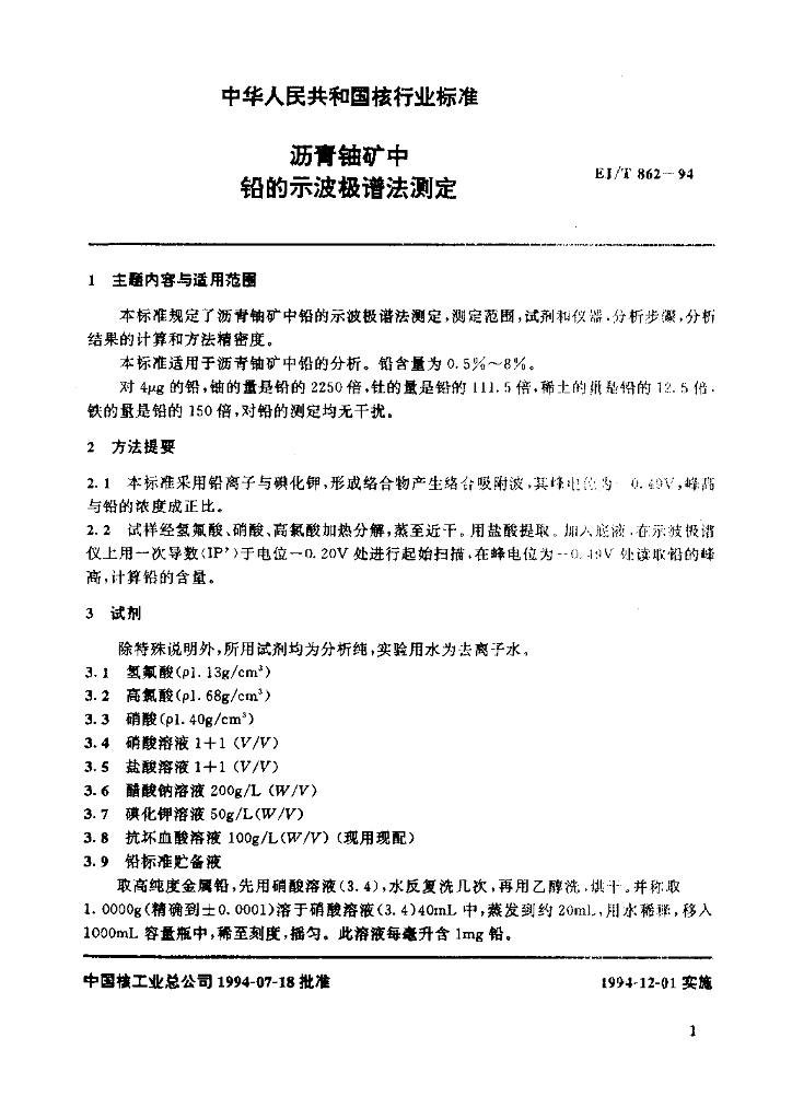 EJ/T 862-1994 沥青铀矿中铅的示波极谱法测定