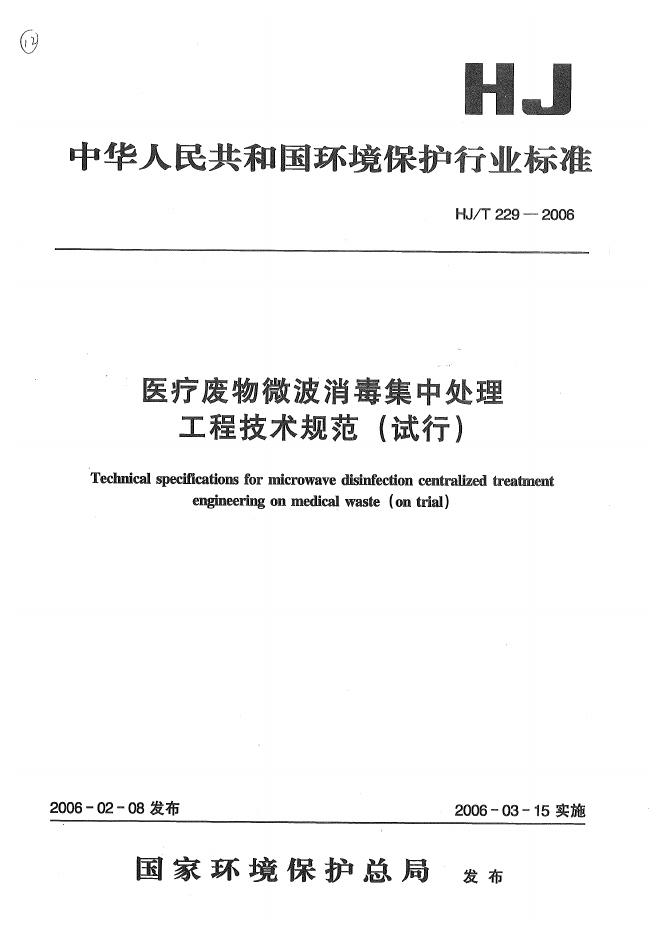 HJ/T 229-2006 医疗废物微波消毒集中处理工程技术规范(试行)
