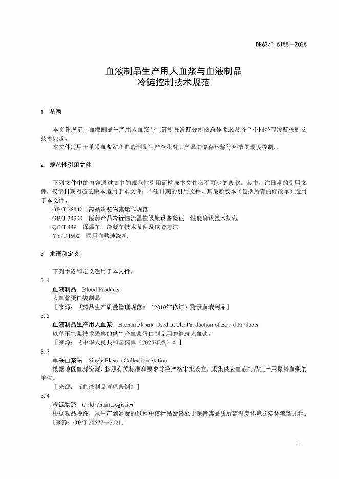 DB62/T 5155-2025 血液制品生产用人血浆与血液制品冷链控制技术规范