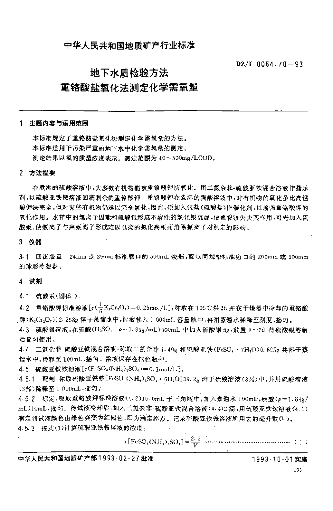 DZ/T 0064.70-1993 地下水质检验方法 重铬酸盐氧化法测定化学需氧量