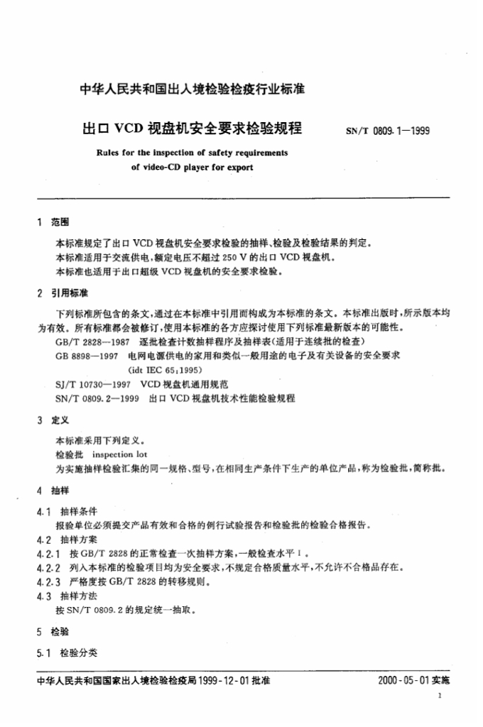SN/T 0809.1-1999 出口VCD视盘机安全要求检验规程
