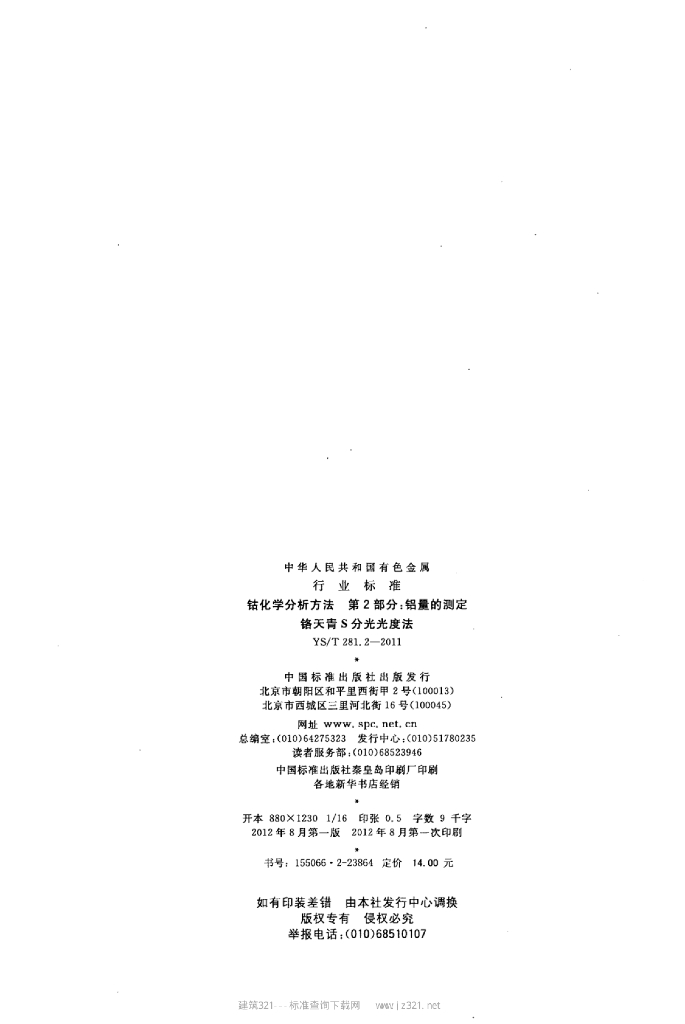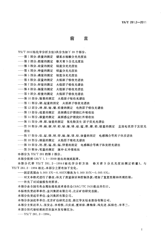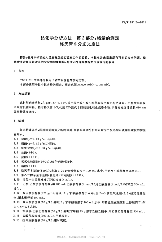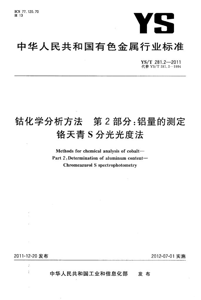 YS/T 281.2-2011 钴化学分析方法 第2部分:铝量的测定铬天青S分光光度法