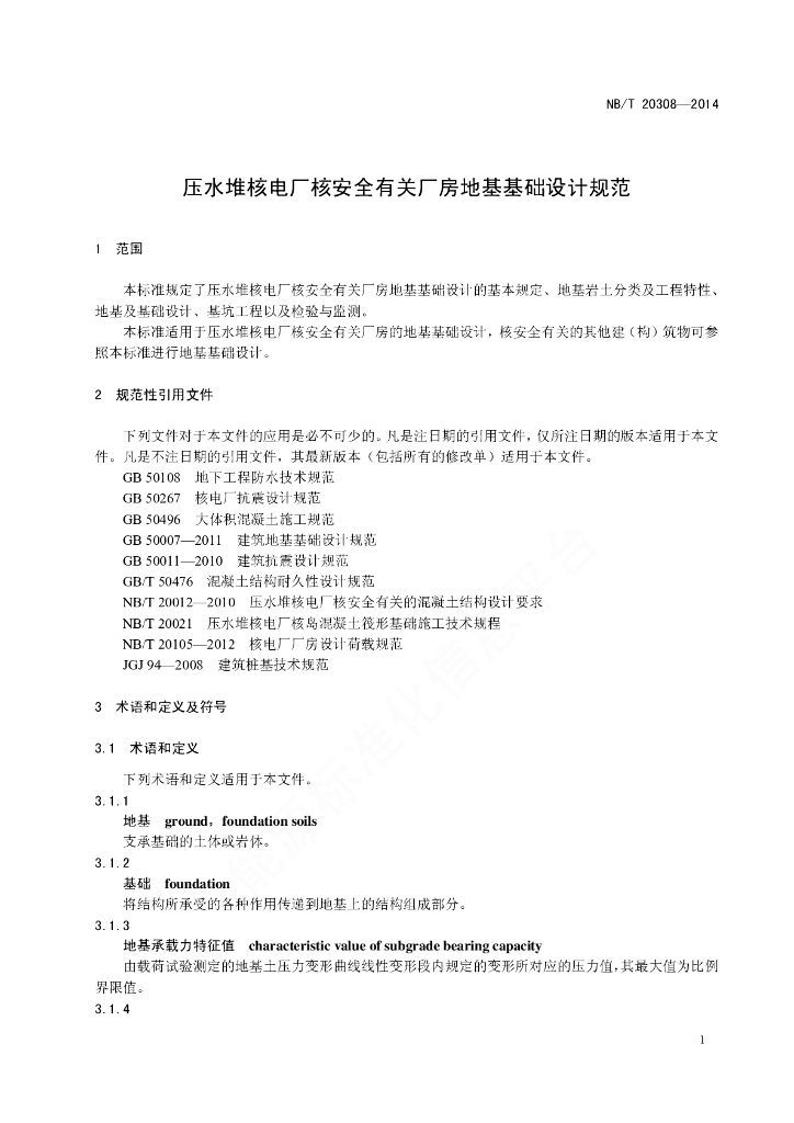 NB/T 20308-2014 压水堆核电厂核安全有关厂房地基基础设计规范