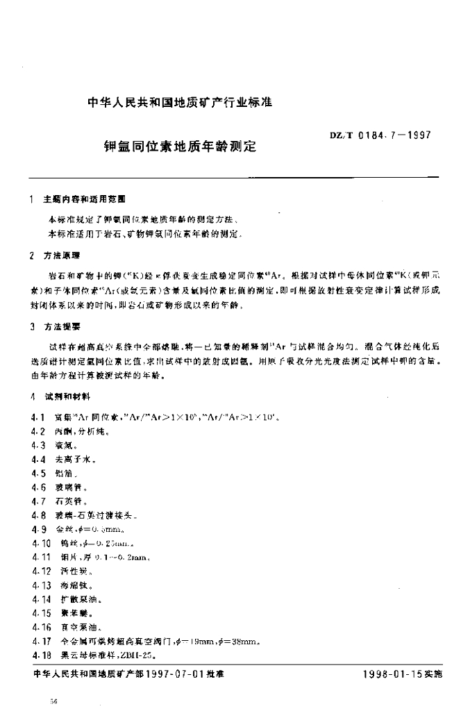DZ/T 0184.7-1997 钾氩同位素地质年龄测定