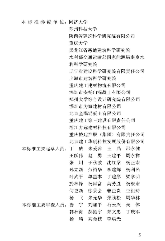 同济大学、苏州科技大学、陕西省建筑科学研究院有限公司、重庆大学、黑龙江省寒地建筑科学研究院、水利部交通运输部国家能源局南京水利科学研究院、辽宁省建设科学研究院有限责任公司、上海市建筑科学研究院、重庆建工建材物流有限公司、深圳市安托山混凝土有限公司、郑州大学综合设计研究院有限公司、深圳市为海建材有限公司、北京金隅混凝土有限公司、重庆建工第三建设有限责任公司、浙江方远建材科技有限公司、重庆城建控股(集团)有限责任公司、北京建工华创科技发展股份有限公司