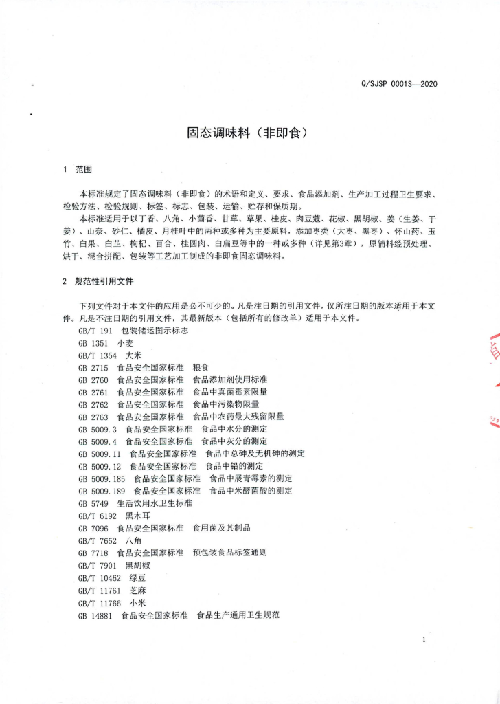Q/SJSP 0001S-2020 固态调味料(非即食)