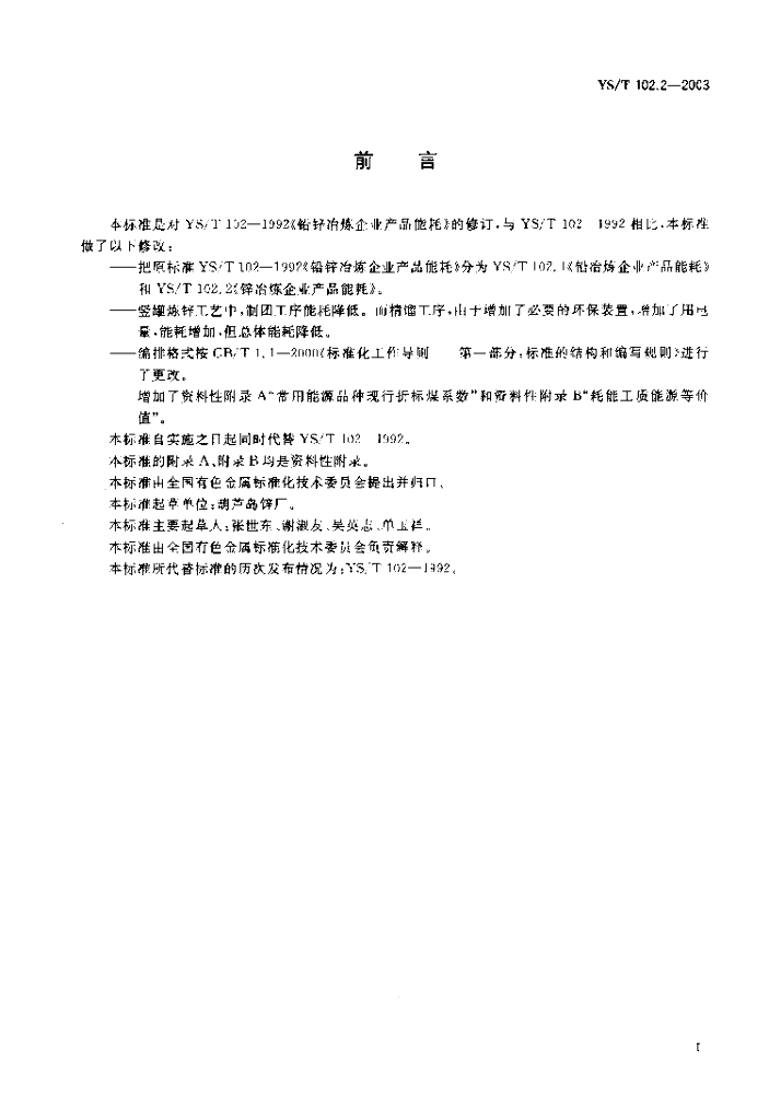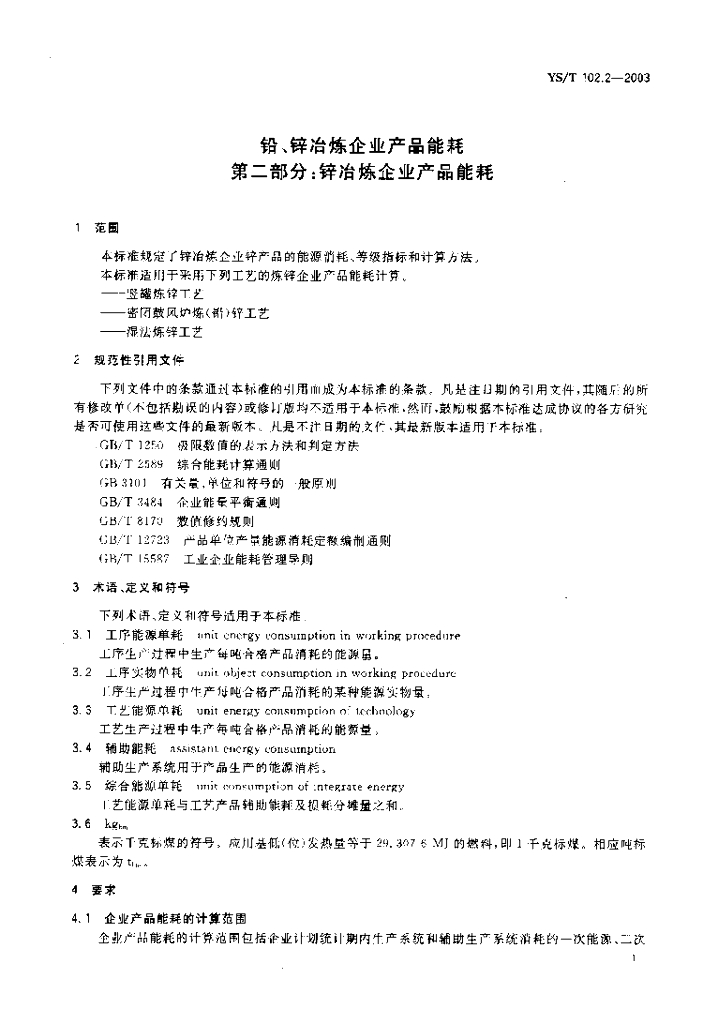 YS/T 102.2-2003 铅、锌冶炼企业产品能耗 第二部分:锌冶炼企业产品能耗