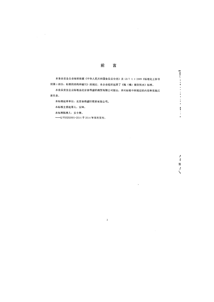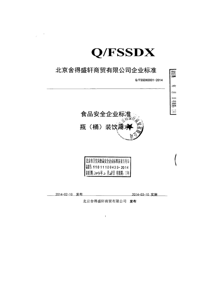 Q/FSSDX 0001-2014 北京舍得盛轩商贸有限公司 瓶(桶)装饮用水