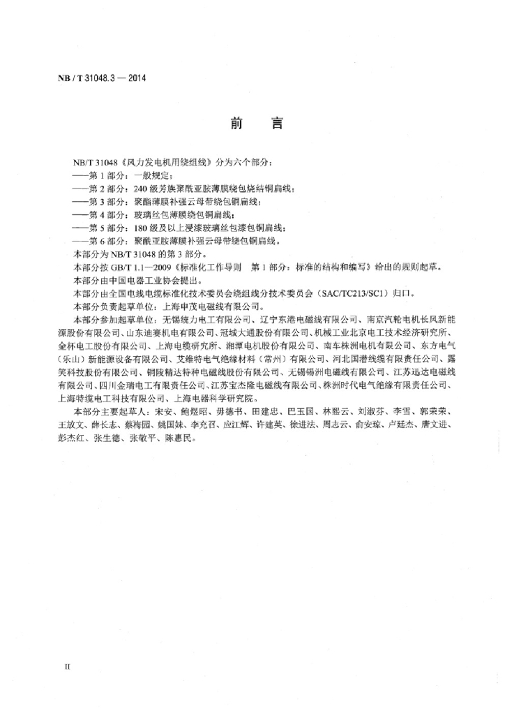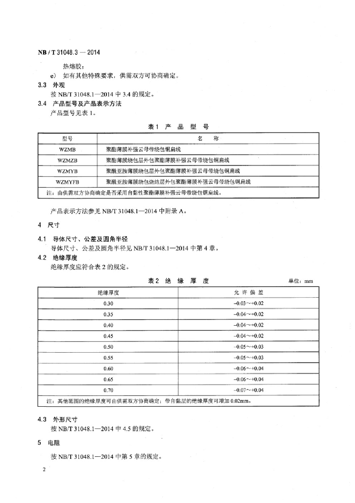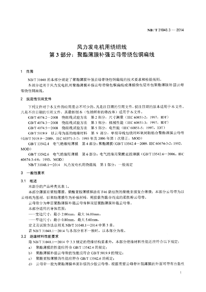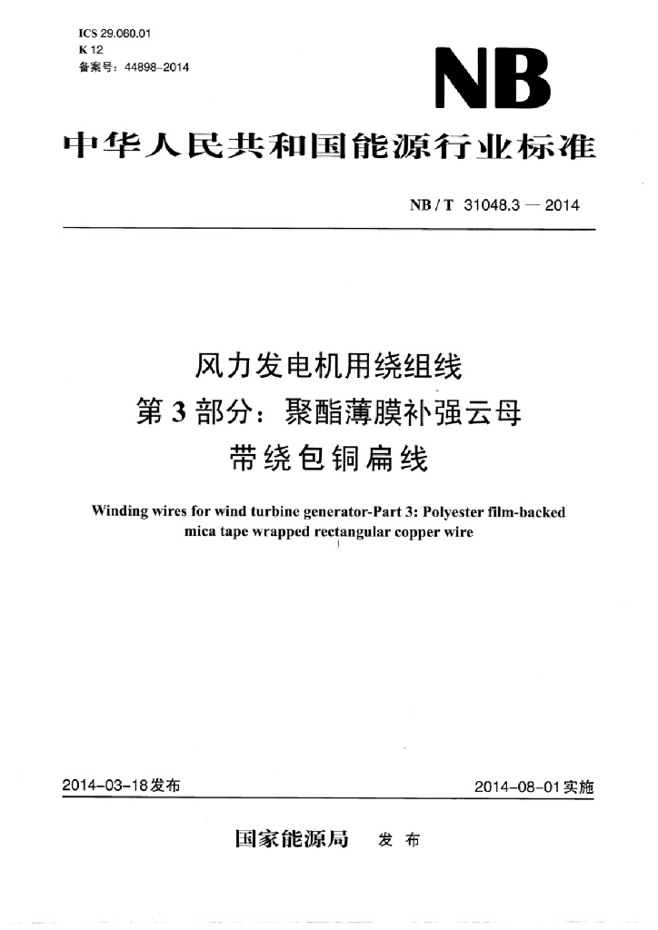 NB/T 31048.3-2014 风力发电机用绕组线 第3部分:聚酯薄膜补强云母带绕包铜扁线