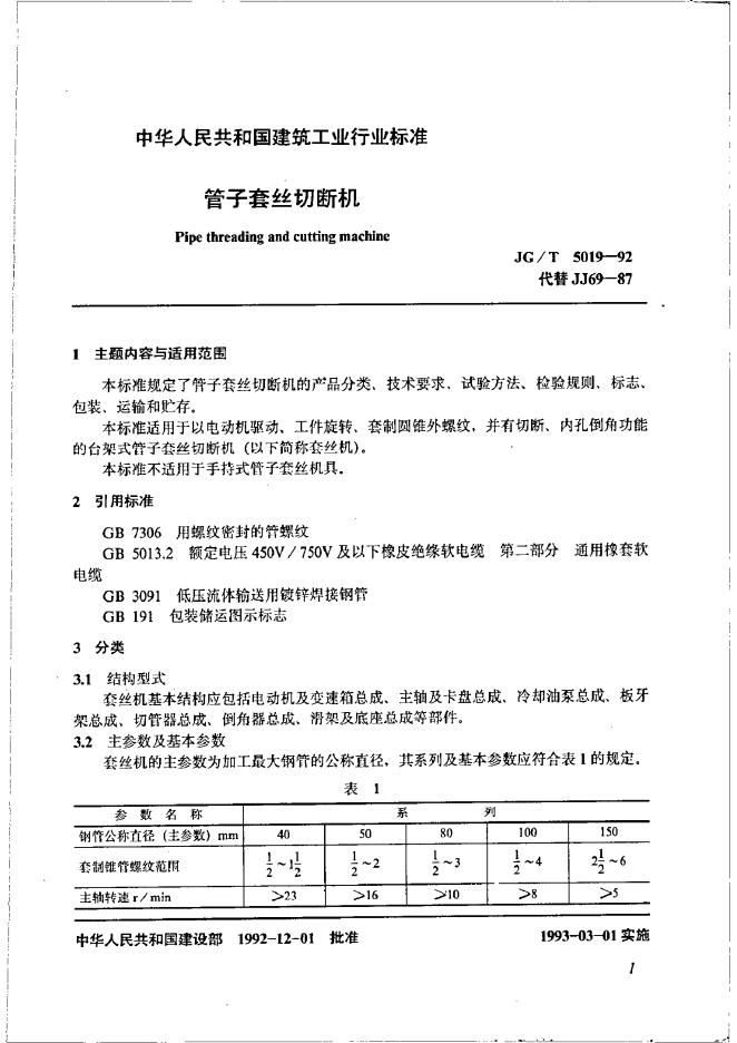 JG/T 5019-1993 管子套丝切断机