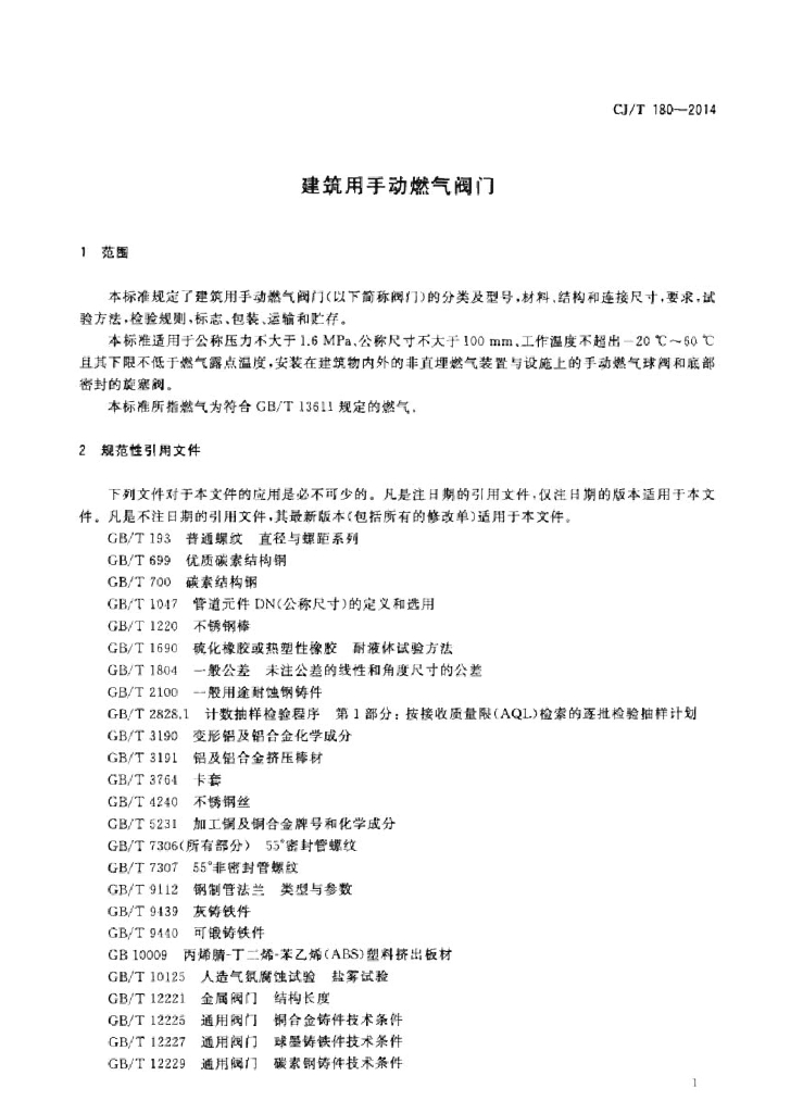 CJ/T 180-2014 建筑用手动燃气阀门