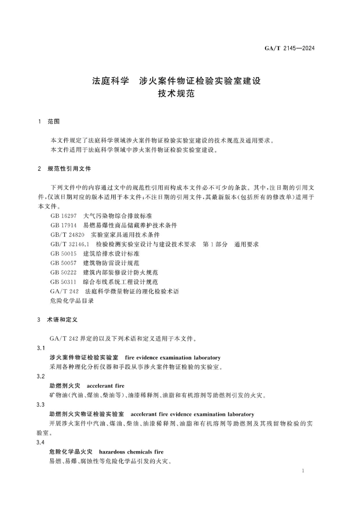 GA/T 2145-2024 法庭科学 涉火案件物证检验实验室建设技术规范