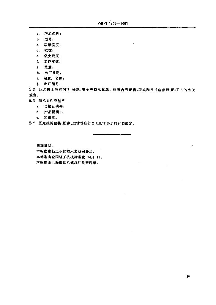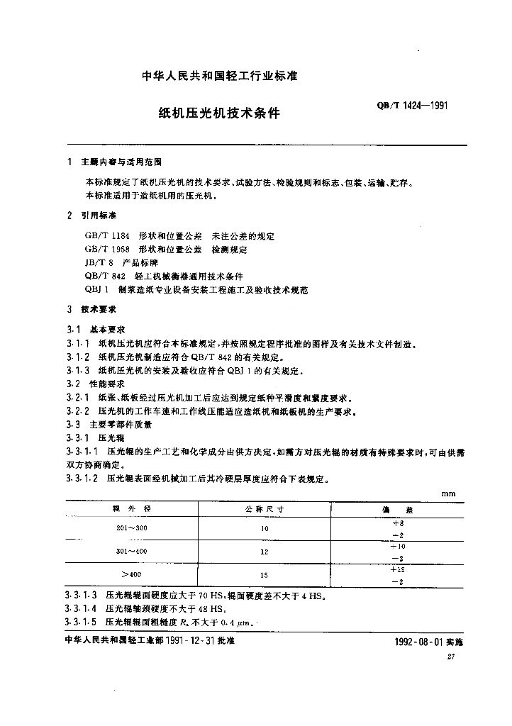 QB/T 1424-1991 纸机压光机技术条件