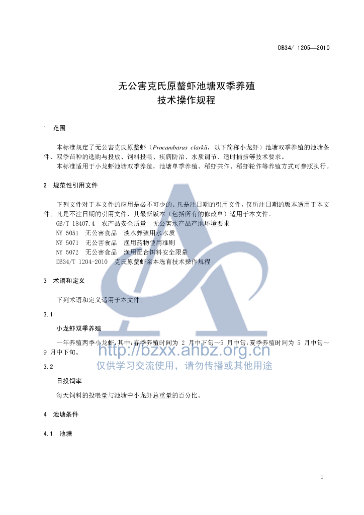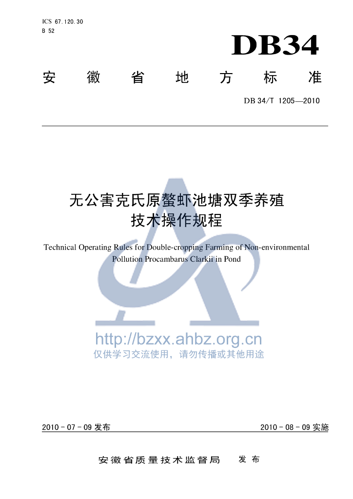 DB34/T 1205-2010 无公害克氏原螯虾池塘双季高效养殖技术操作规程