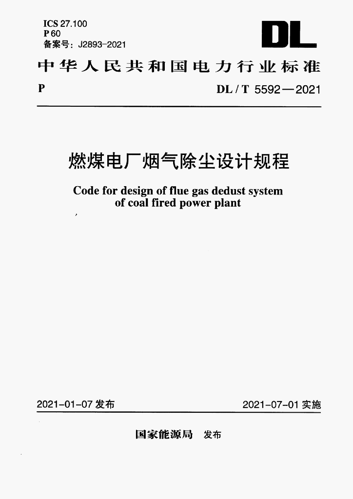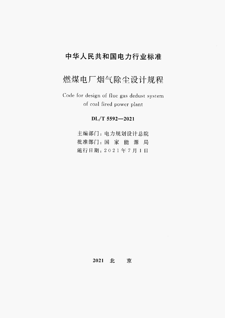 DL/T 5592-2021 燃煤电厂烟气除尘设计规程