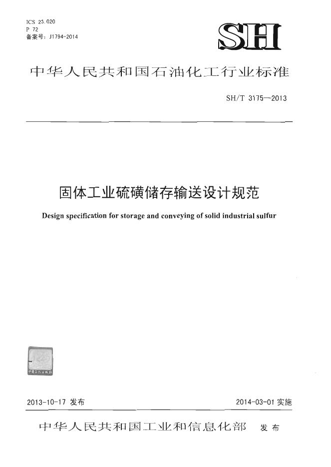SH/T 3175-2013 固体工业硫磺储存输送设计规范