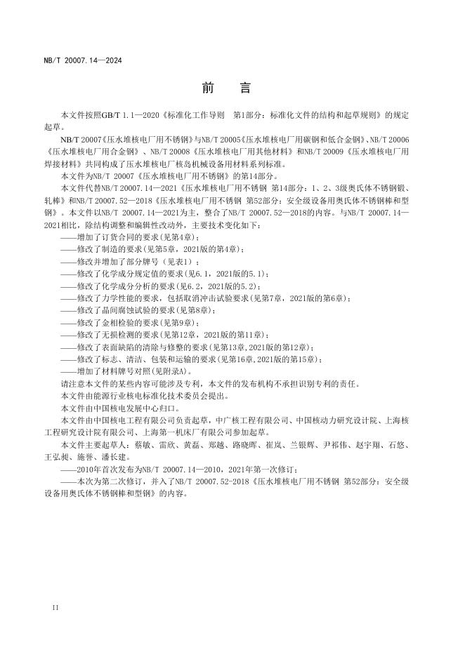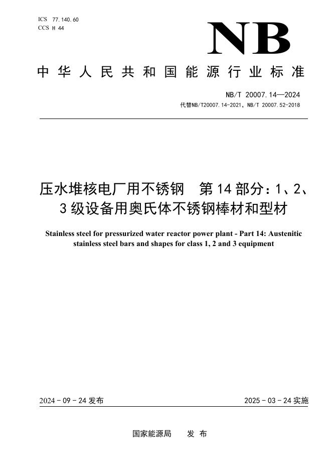NB/T 20007.14-2024 压水堆核电厂用不锈钢 第14部分:1、2、3级设备用奥氏体不锈钢棒材和型材