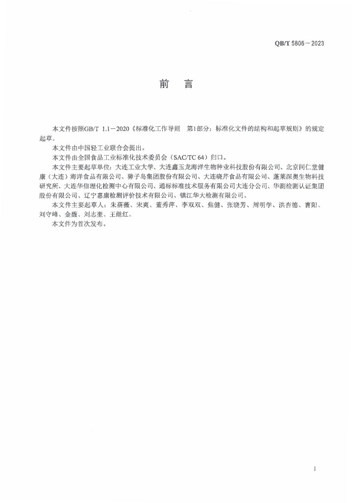 大连工业大学、大连鑫玉龙海洋生物种业科技股份有限公司、北京同仁堂健康(大连)海洋食品有限公司、獐子岛集团股份有限公司、大连晓芹食品有限公司、蓬菜深奥生物科技研究所、大连华信理化检测中心有限公司、通标标准技术服务有限公司大连分公司、华测检测认证集团股份有限公司、辽宁惠康检测评价技术有限公司、镇江华大检测有限公司