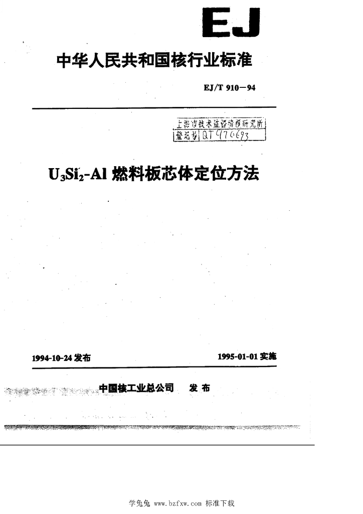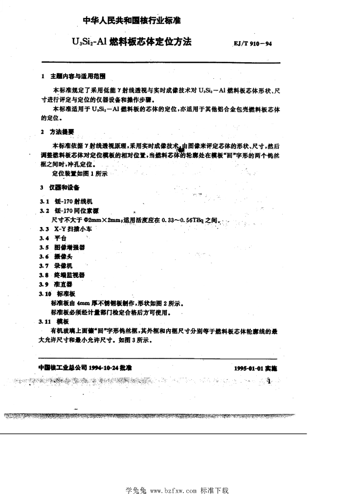 EJ/T 910-1994 铀三硅二-铝燃料板芯体定位方法