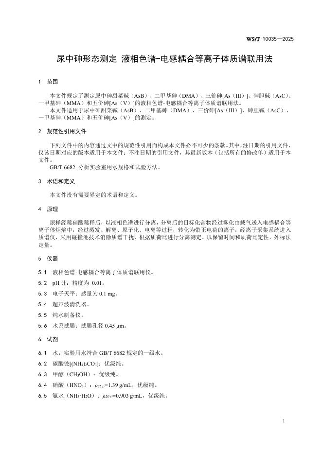 WS/T 10035-2025 尿中砷形态测定 液相色谱-电感耦合等离子体质谱联用法