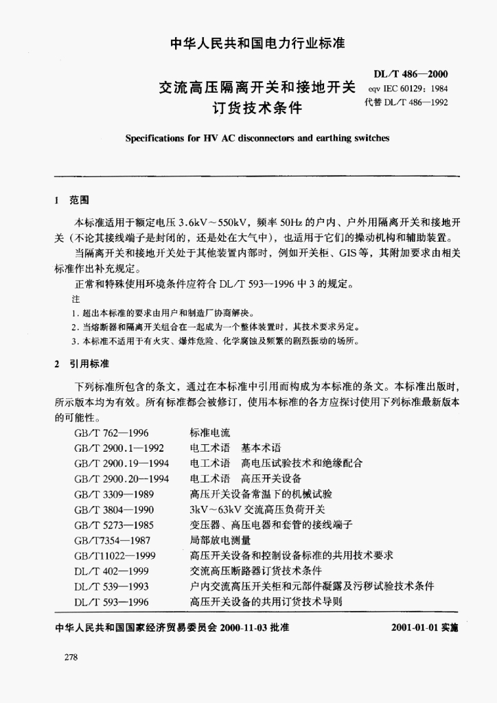 DL/T 486-2000 交流高压隔离开关和接地开关订货技术条件