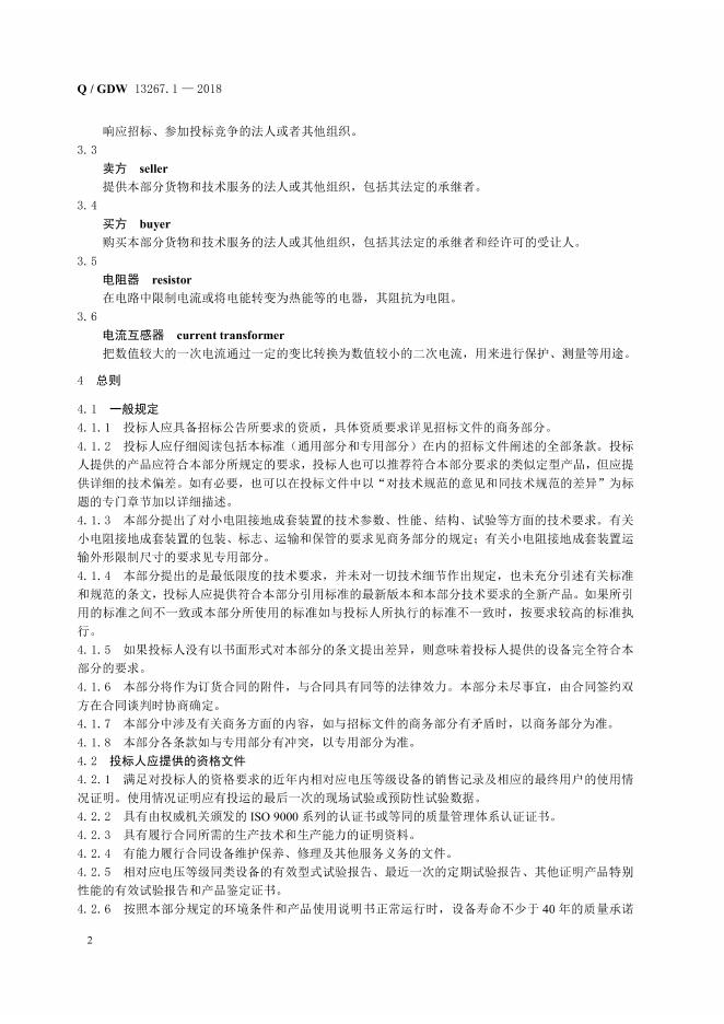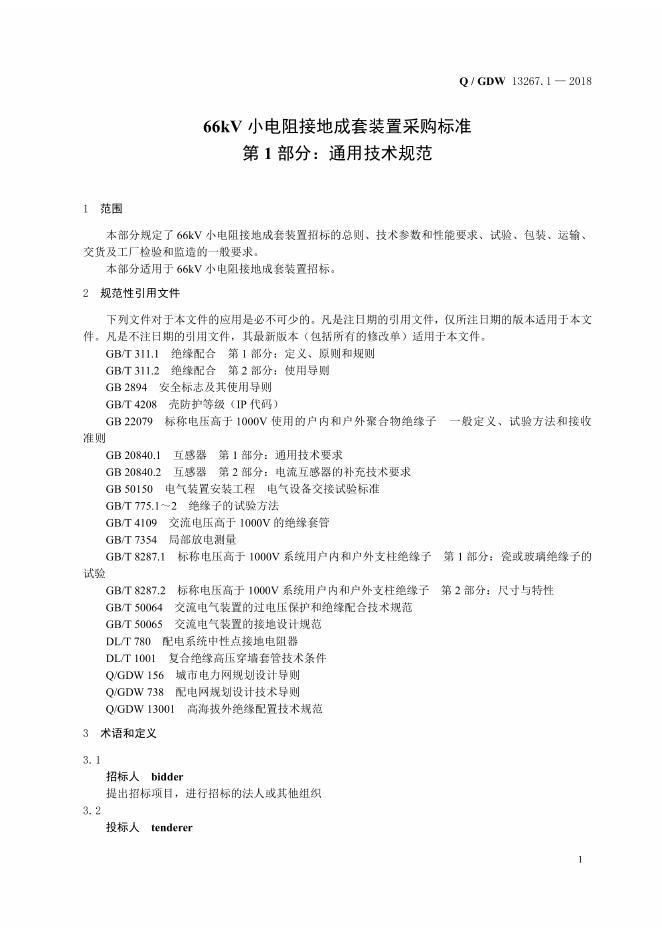 Q/GDW 13267.1-2018 66kV小电阻接地成套装置采购标准 第1部分:通用技术规范
