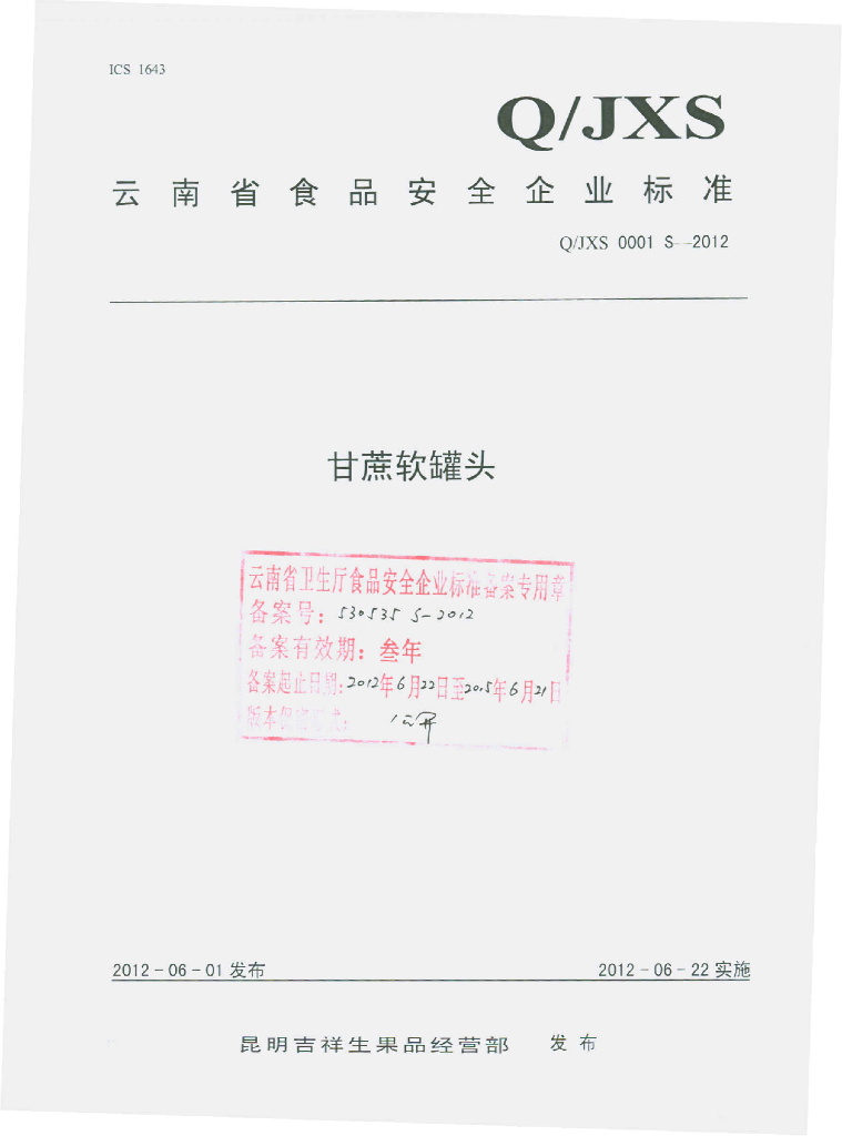 Q/JXS 0001S-2012 甘蔗软罐头