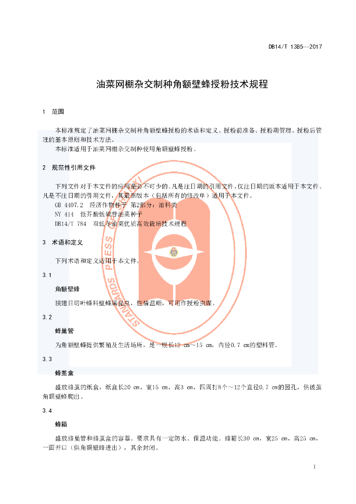 DB14/T 1385-2017 油菜网棚杂交制种角额壁蜂授粉技术规程