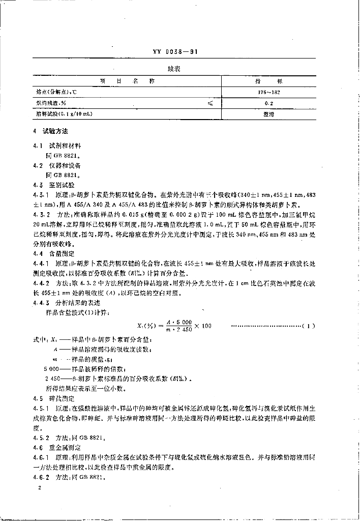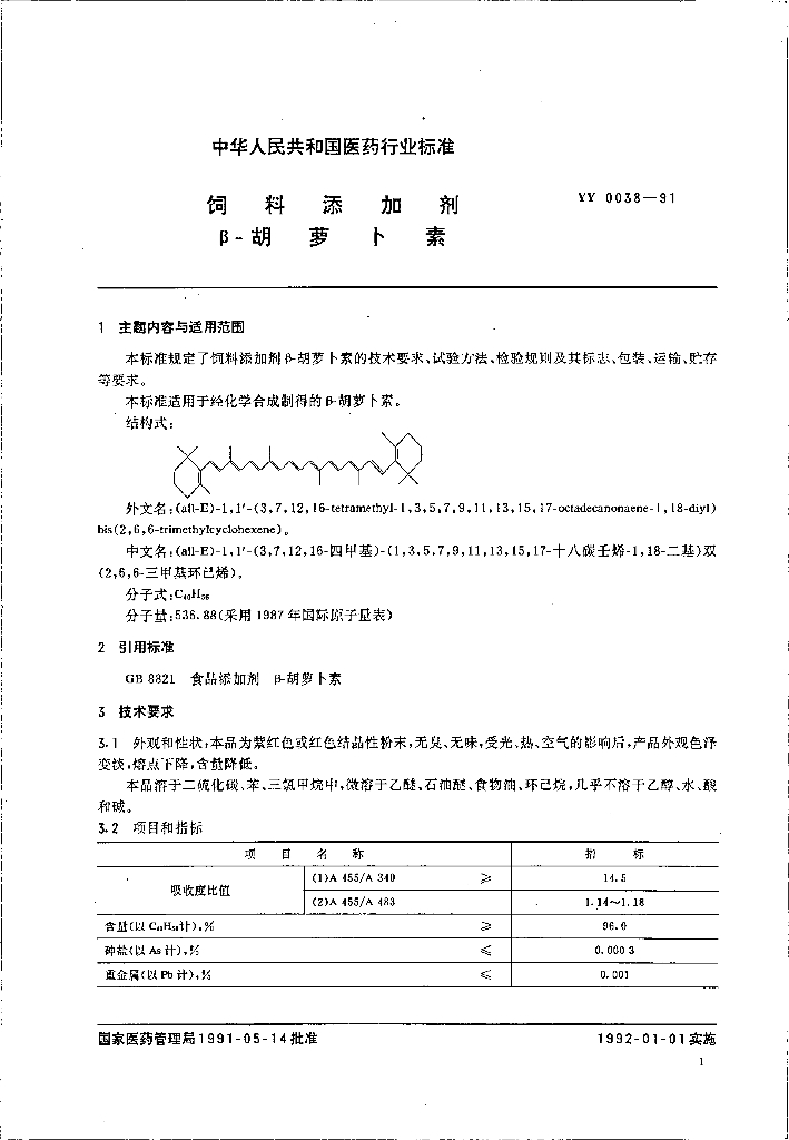 YY 0038-1991 饲料添加剂 β-胡萝卜素