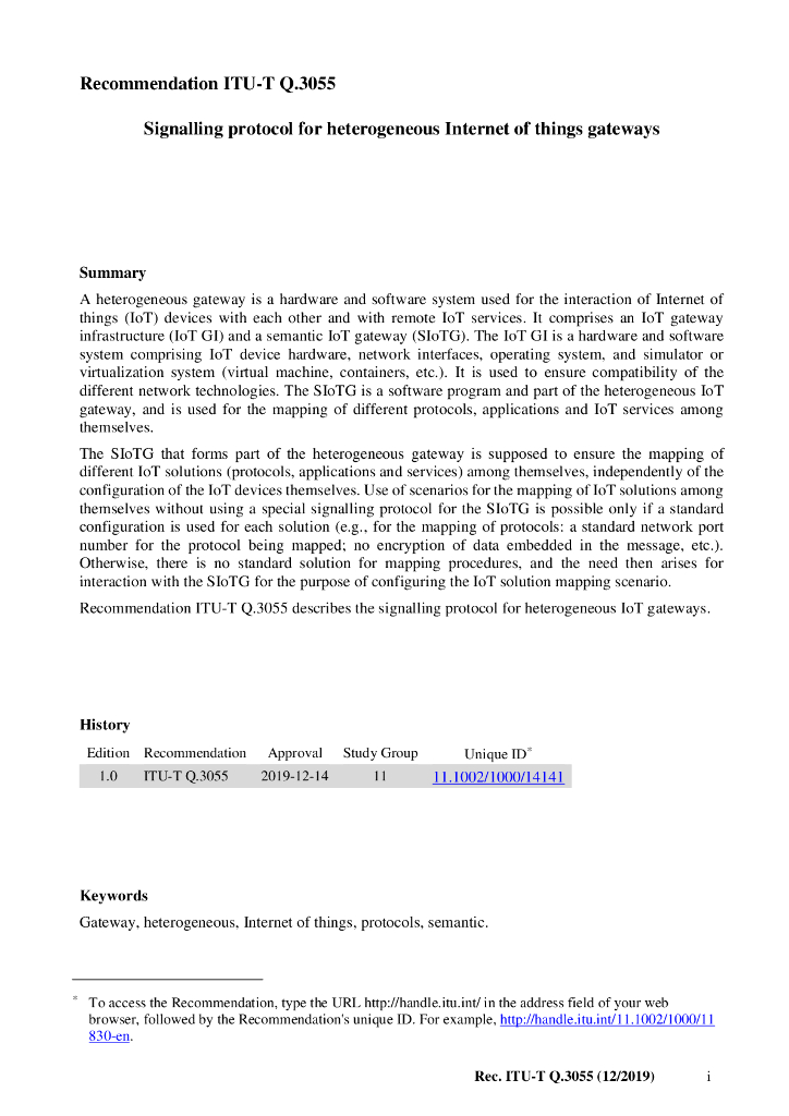 ITU-T Q.3055-2019 异构物联网网关的信令协议