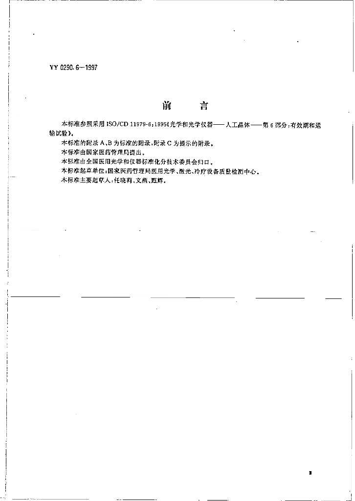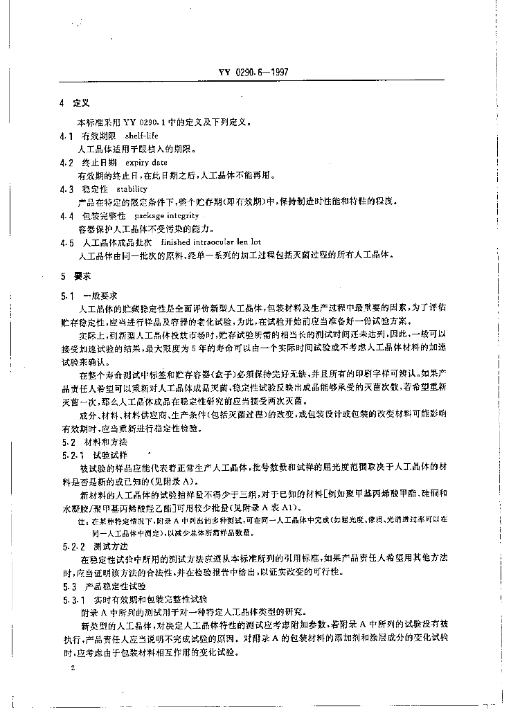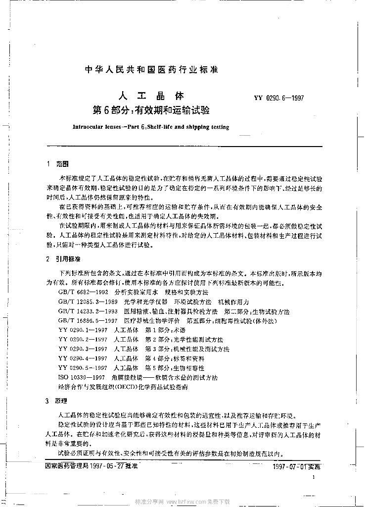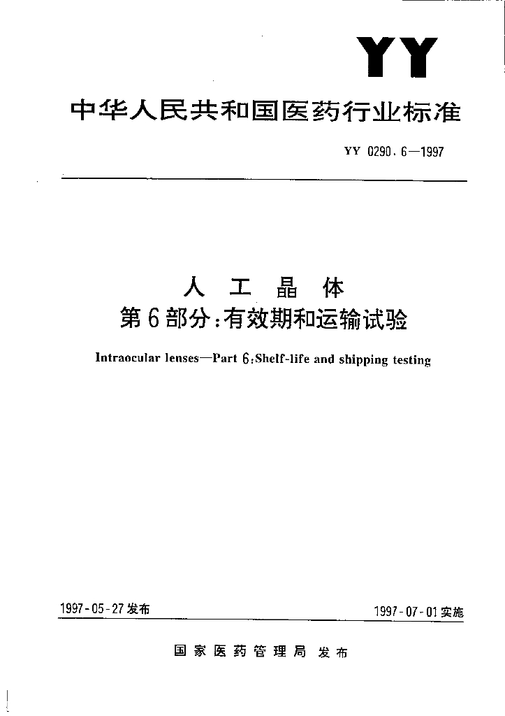YY 0290.6-1997 人工晶体 第6部分:有效期和运输试验